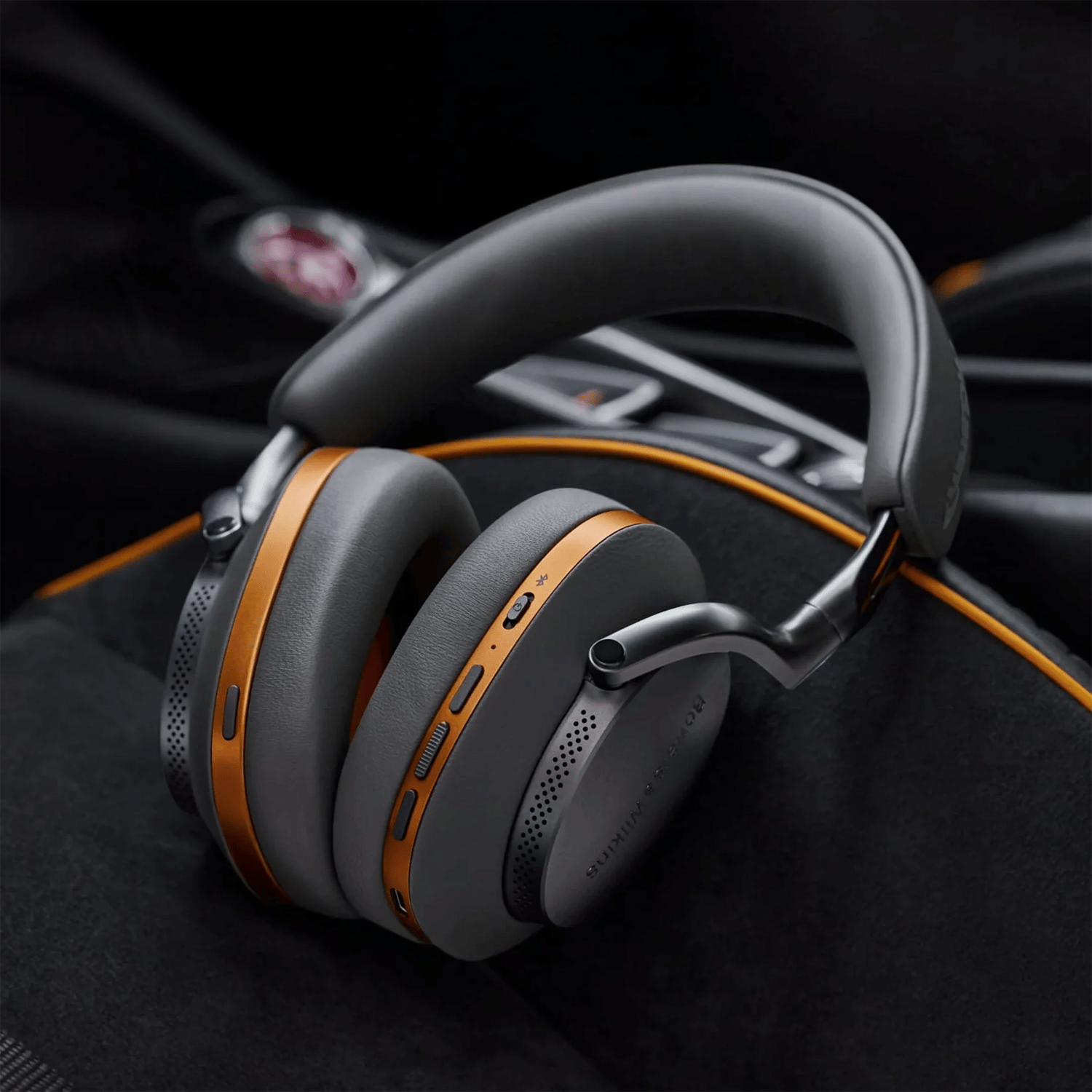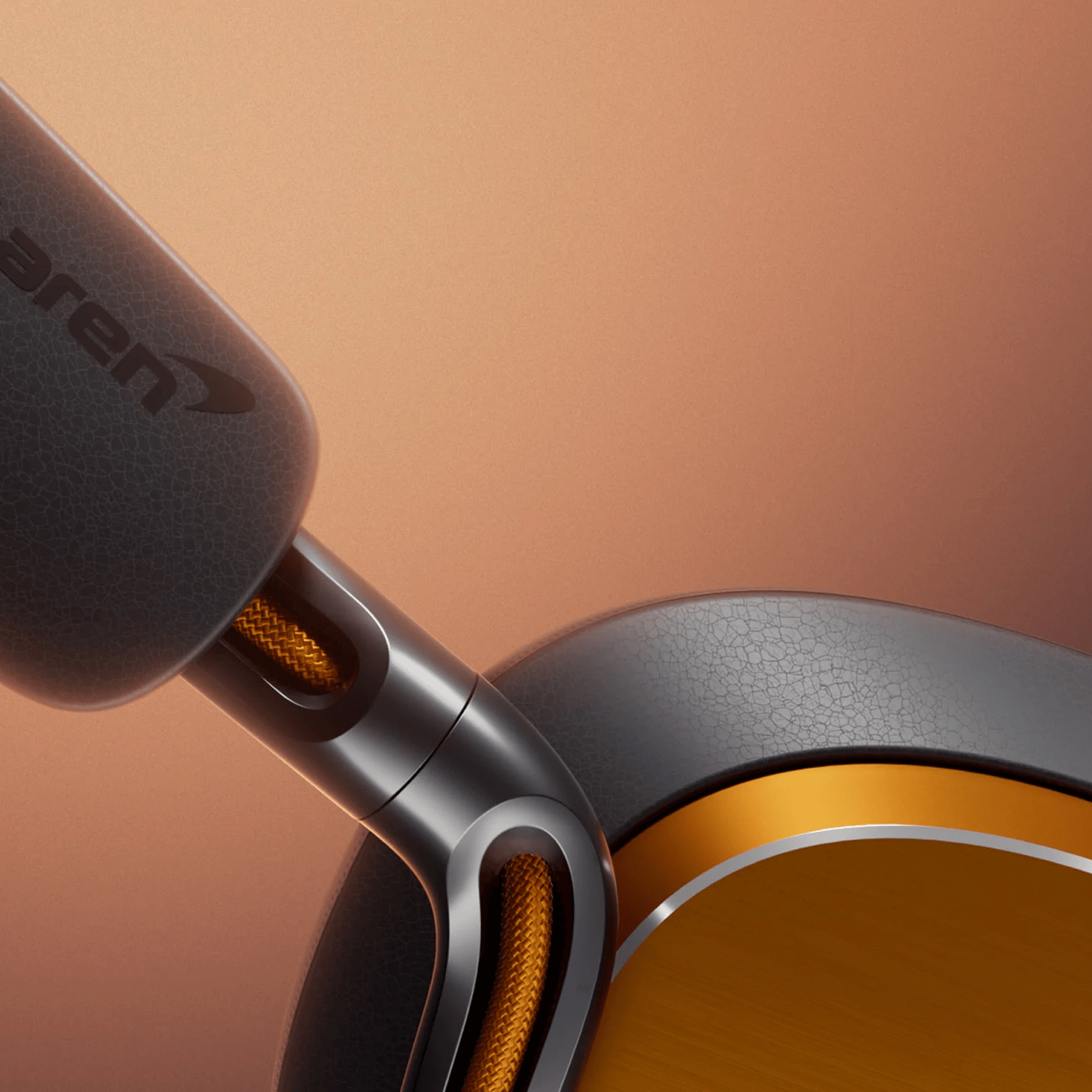 Anthracite Gray Nappa leather across every primary surface and metallic papaya-colored earcups assert a bold new elegance while the embossed McLaren logo on the headband completes the look.